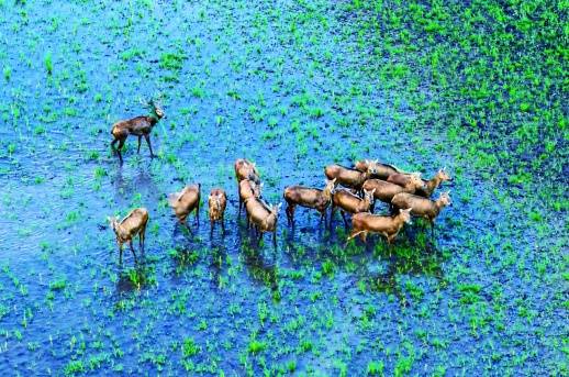 洞庭湖畔,麋鹿的故事堪稱傳奇。這種曾被尊為神獸的物種,自1900年在中國本土滅絕后,歷經波折重返故土。如今,在洞庭湖區,麋鹿種群已壯大到300余頭。它們的回歸之路充滿艱辛:1998年洪水期間,湖北石首天鵝洲的11頭麋鹿泅渡至洞庭湖,形成野生自然衍生種群;2016年,16頭大豐“鹽堿灘涂濕地”的麋鹿被野放到洞庭湖,實現兩地種群基因融合;2020年,12頭來自北京南海子的麋鹿引入,完成三大種群遷地野化融合。如今,東洞庭湖核心區麋鹿成群,南洞庭湖也出現遷居跡象,這片水域正成為它們安居樂業的家園。