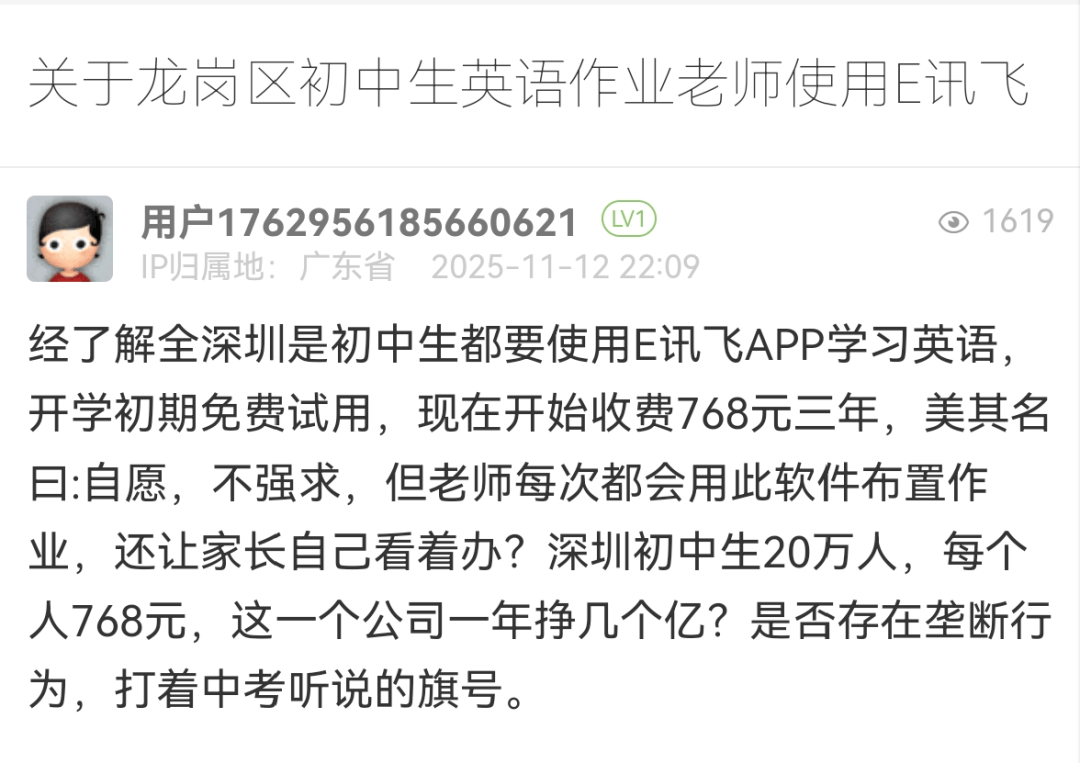 近日,有市民通過(guò)《問(wèn)政深圳》平臺(tái)反映,龍崗區(qū)某初中要求學(xué)生使用一款收費(fèi)APP完成英語(yǔ)作業(yè),引發(fā)家長(zhǎng)對(duì)收費(fèi)合理性的質(zhì)疑。盡管校方稱(chēng)使用該軟件為自愿原則,但家長(zhǎng)指出教師頻繁通過(guò)該平臺(tái)布置任務(wù),且768元的年費(fèi)對(duì)于深圳龐大的初中生群體而言負(fù)擔(dān)較重,同時(shí)懷疑相關(guān)企業(yè)存在市場(chǎng)壟斷行為。